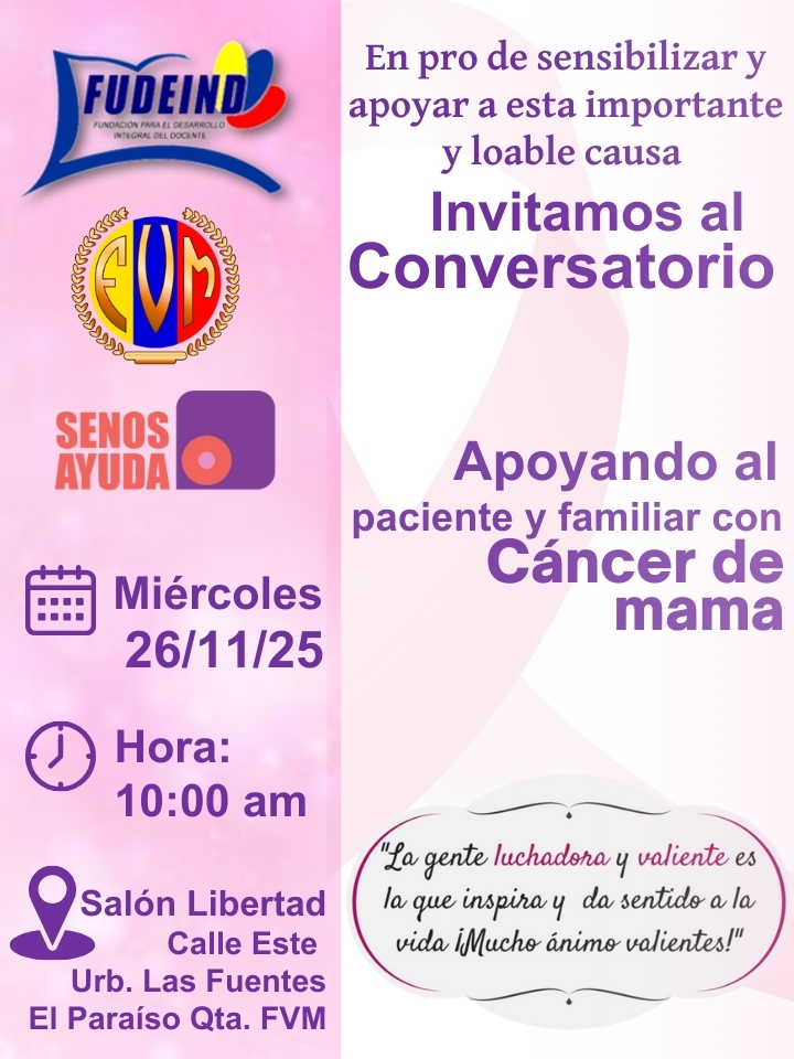 El pasado miércoles 26 de noviembre, la Federación Venezolana de Maestros (FVM) y la Fundación para el Desarrollo Integral del Docente (FUDEIND) llevaron a cabo una jornada formativa y de sensibilización dedicada al cáncer de mama, con el apoyo y la participación de la organización Senos Ayuda A.C.